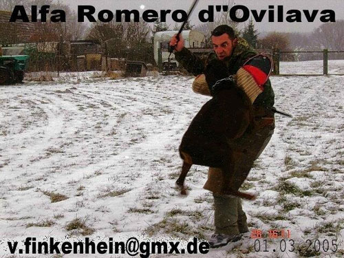 Alfa war ein sehr dominanter und ausdrucksstarker Rüde. Er wurde auf verschiedenen Hundeplätzen im SV, ADRK sowie DV gearbeitet.
